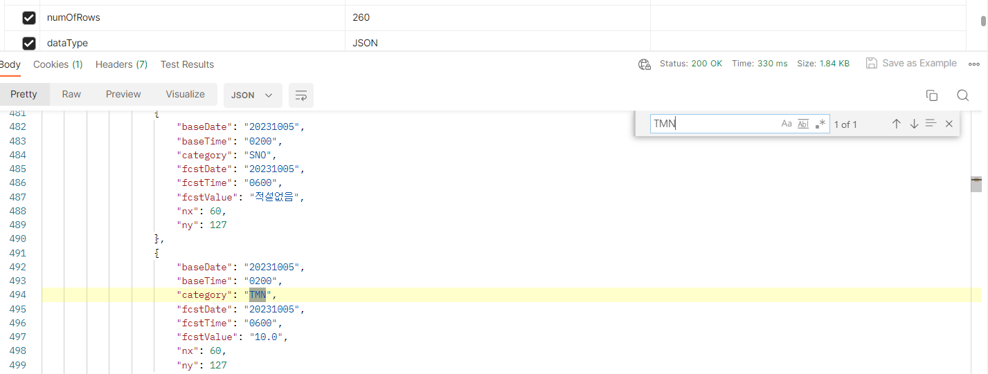 base_time을 새벽 2시로, numOfRows를 260으로 해줬습니다. 💡