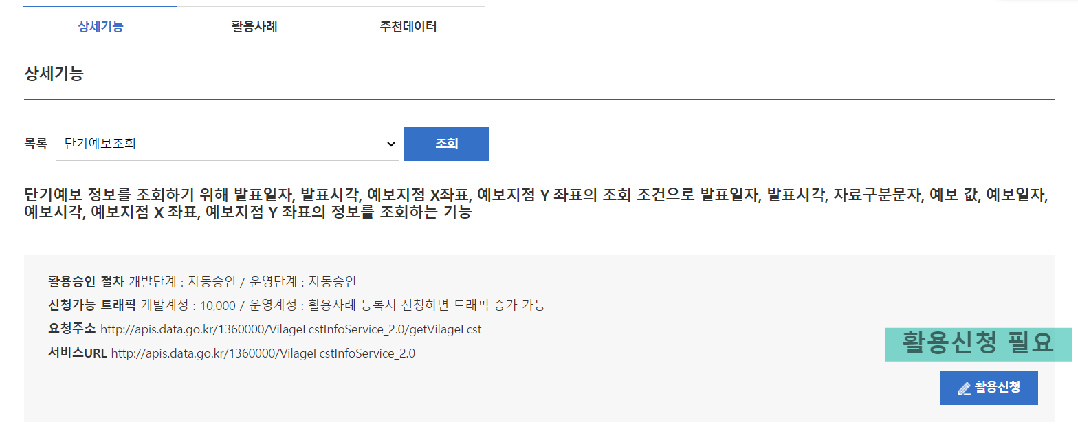 제가 이용한 서비스는 공공데이터포털의 기상청 단기 예보 조회 서비스입니다. ☀️🌦️