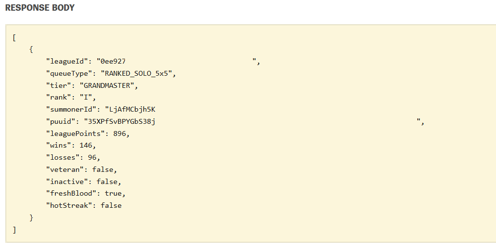 그 밖에도 summonerId, leagueId, 승패 횟수 등을 확인할 수 있습니다.